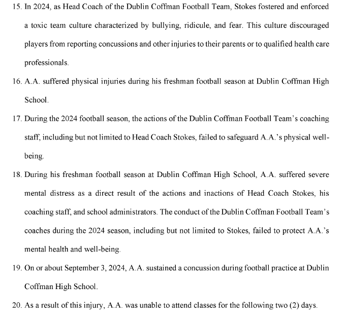 (9-9-25) Todd and Kathy Alles of Dublin allege that their son left Dublin Coffman High School after his first season of playing football in the fall of 2024 amid an abusive team culture led by former Minster Coach Geron Stokes, according to a lawsuit filed Aug. 21 in Franklin County.
