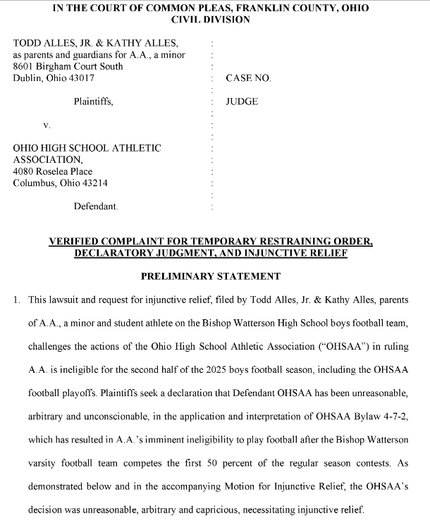 The lawsuit is targeted against the OHSAA’s ruling that Alles son would not eligible to play football in the second part of this (2025) season and playoffs after he had transferred to Bishop Watterson last January from Coffman.