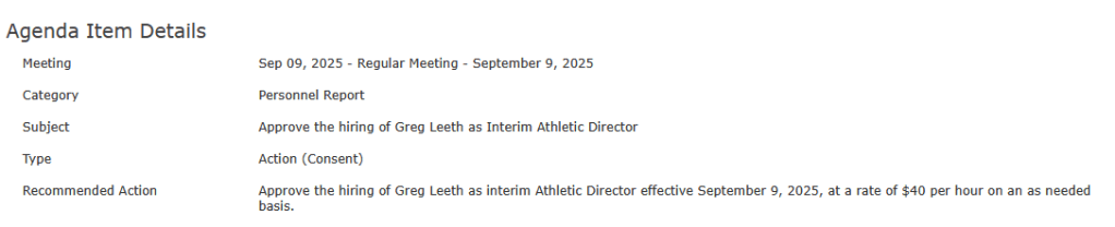 At an August Lincolnview Schools BOE meeting recently retired athletic director Greg Leeth was hired as a consultant athletic administrator on an as-needed basis up to 100 hours.
