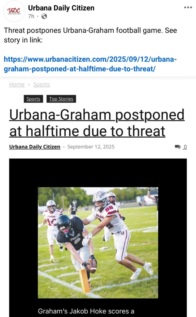 (9-13-25) The Urbana Daily Citizen reported that the Graham and Urbana game last night was suspended after a threat was made toward the stadium just as the teams prepared to take the field for the second half with Graham leading 40-27.