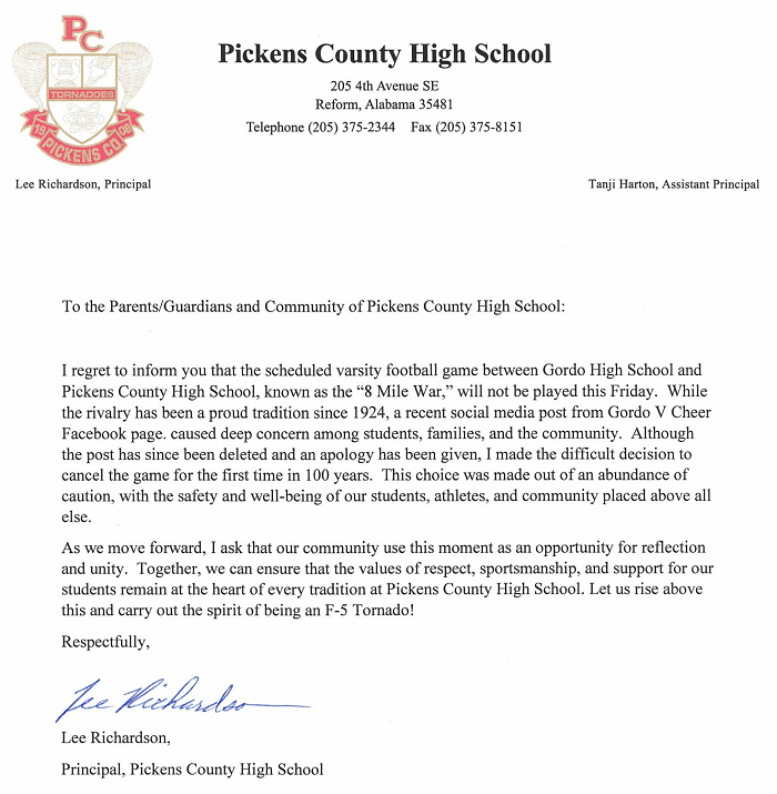 On Wednesday, Pickens County High School Principal Lee Richardson announced the game would be canceled.