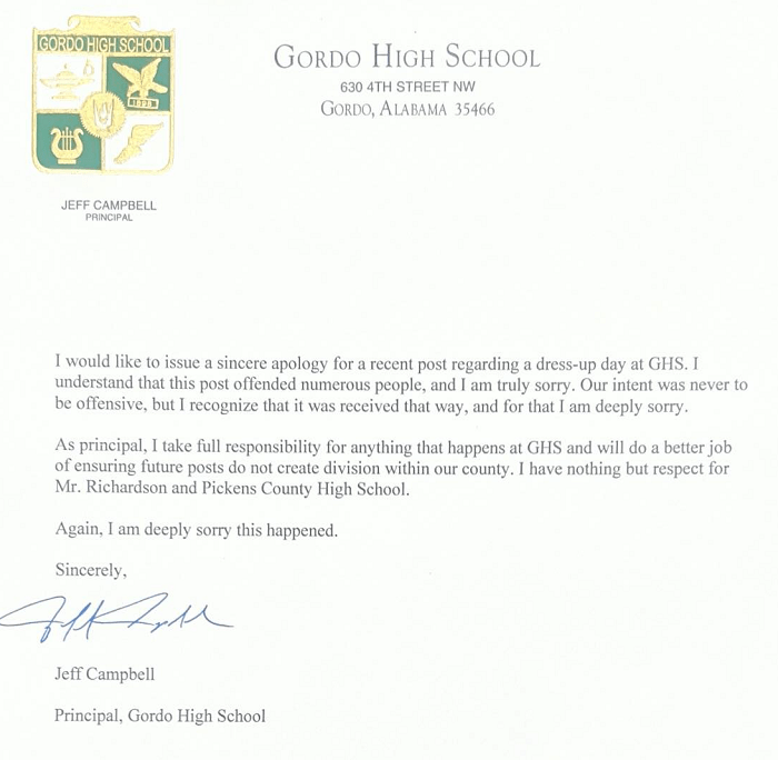 On Tuesday, Pickens County County School System Superintendent Shawn McDaniel sent a letter to parents in the system saying an investigation determined no discrimination or profiling was intended in the post. The letter also apologized on behalf of the district for the post.