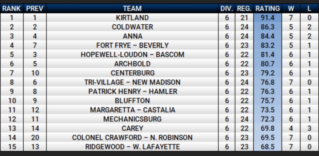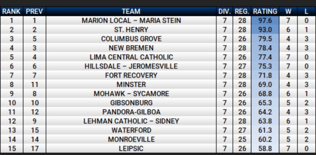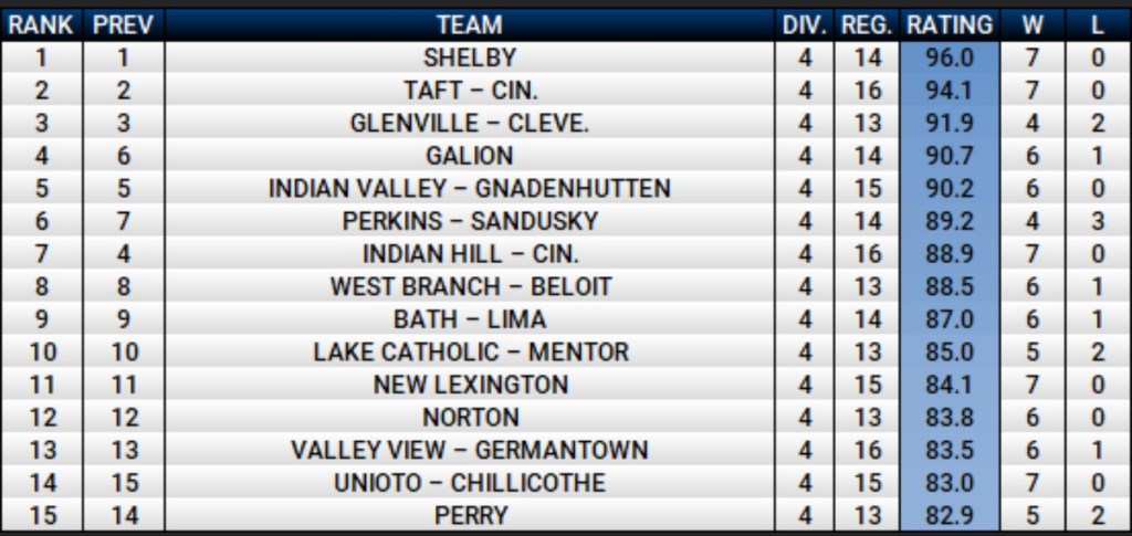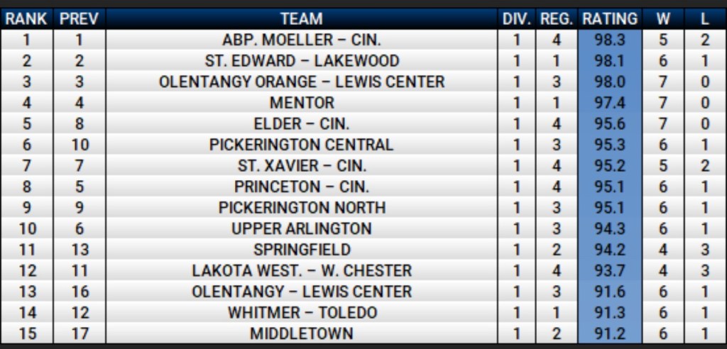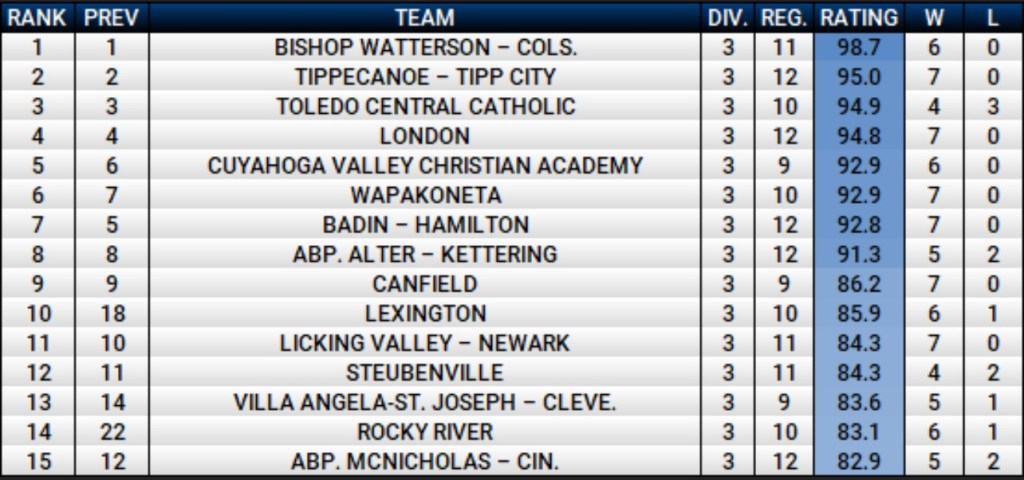 It appears that Wapakoneta and Toledo Central Catholic are on a collision course to meet in the Region 10 championship. However, Lexington may have something to say about that. After questions about the strength of their wins, the Minutemen destroyed 5–2 West Holmes 41–7. Staying in Region 10, Rocky River debuted in the top 15 following a 35–0 win over North Olmsted.