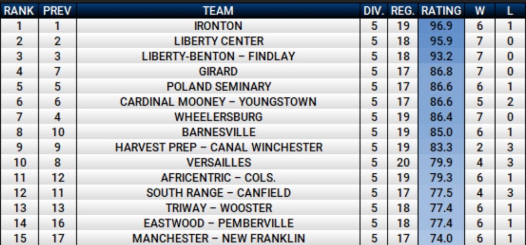 With all the attention on Ironton, Liberty Center, and Liberty-Benton, the boom in eastern Ohio has been largely ignored. Cardinal Mooney has won three straight while navigating one of the toughest schedules in Division V. Poland Seminary has continued its strong tradition, starting 6–1. (Yes, Canfield, we see you.) Girard climbs into the top five after a 56–35 win over South Range. Those two will square off in Girard in Week 8 for Youngstown supremacy.