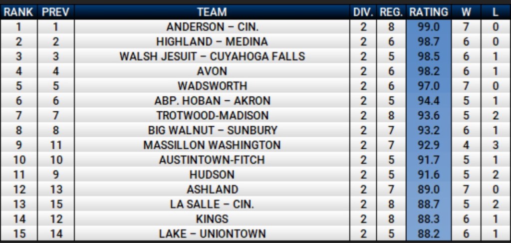 The top five look exactly the same as they did a week ago, with Anderson, Walsh Jesuit, Avon, and Wadsworth all logging wins. Trotwood-Madison rebounded after a pair of out-of-state losses. The Rams pitched their first shutout of the season, beating Dunbar 45–0. Massillon isn’t going away either, following a 28–14 win over Missouri’s 2023 Division V state champion Cardinal Ritter.