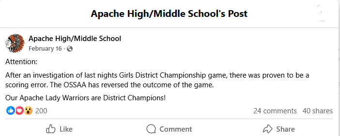 The OSSAA reversed the outcome of the game after Coach King and his team reported the scoring error. Although Academy had initially won the championship, the correction meant Apache should have won.
