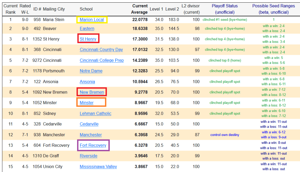 In D III Region 10… Wapakoneta has clinched a playoff spot and receives a week one bye, while St. Marys has clinched a playoff spot presently in the #10 spot and will play in round 1 of the playoffs. Shawnee, currently at #4, has also clinched a playoff spot, while at #13 Defiance could use a win to sneak in. Celina has been mathematically eliminated.
