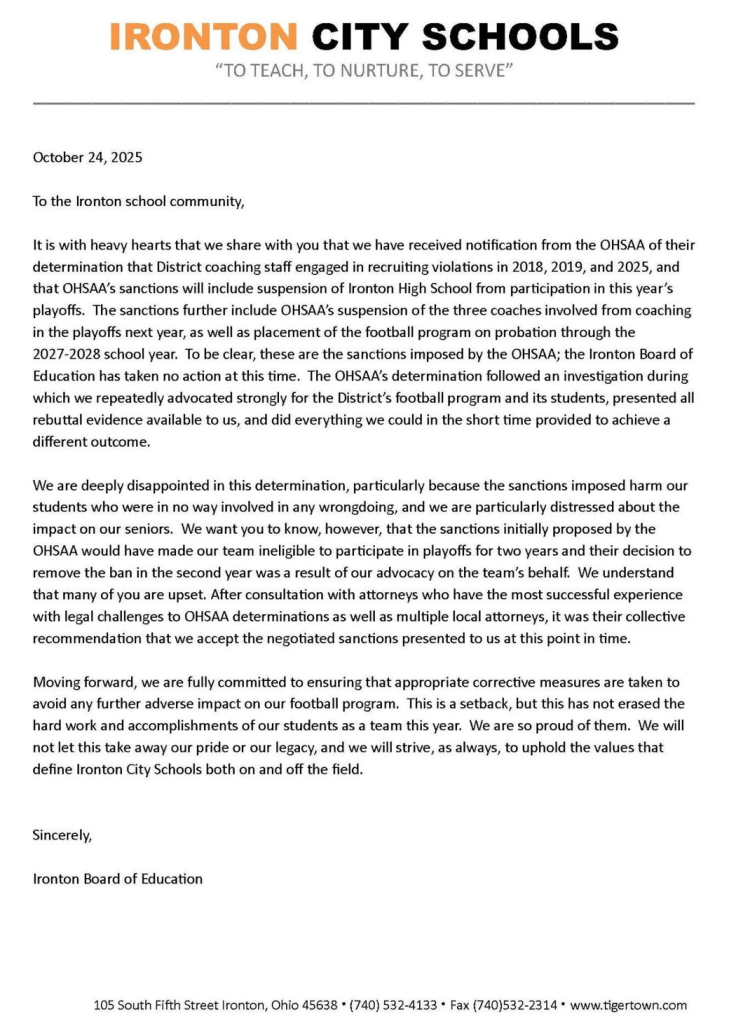 (10-24-25) Ironton City Schools Board of Education issued a statement tonight on the ruling for the Fighting Tigers football team made by the OHSAA.