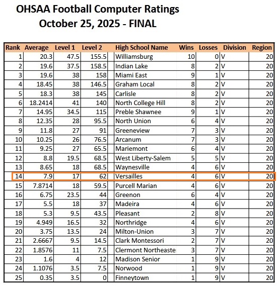 (10-26-25) — Versailles will not be a part of this year’s D V State Football playoffs. The Tigers finished the season at 4-6 and were ranked #14 in D V Region 20.