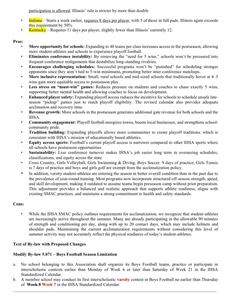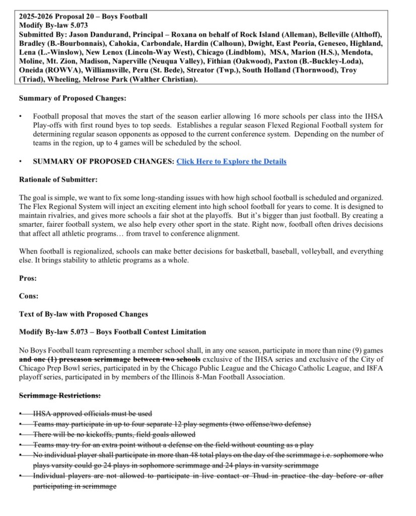 (11-2-25) A total of 23 proposals, including two for changes in football playoff formats, that could potentially amend the Illinois High School Association (IHSA) Constitution and By-laws were received from principals and official representatives of IHSA member schools for the IHSA’s 2025-26 legislative cycle.
