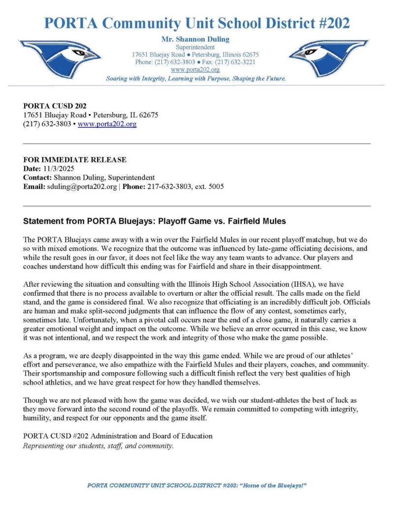 (11-3-25) The Illinois High School Association (IHSA) issued an apology to the Fairfield Mules for an officiating mistake that allowed PORTA an extra down to kick a game-winning field goal as time expired in Saturday’s 9-8 first round 3A playoff game. The result stands.