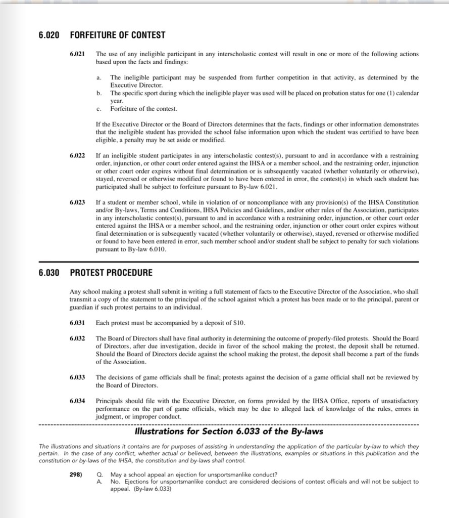 IHSA by-law 6.033 states that ‘the decisions of game officials shall be final; protests against the decision of a game official shall not be reviewed by the Board of Directors.’