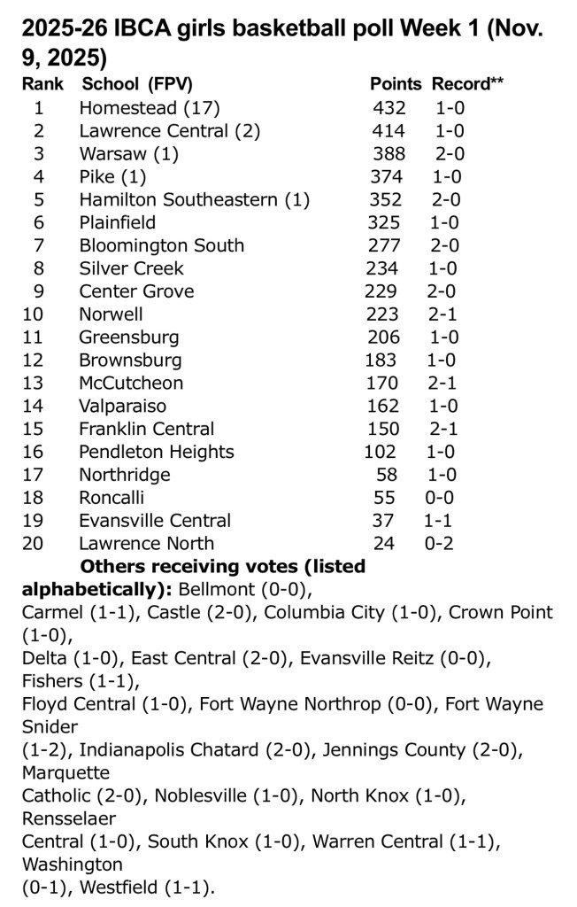 Below are results of the IBCA girls’ basketball poll for Week 1 of the the 2025-26 season (Nov. 9, 2025).