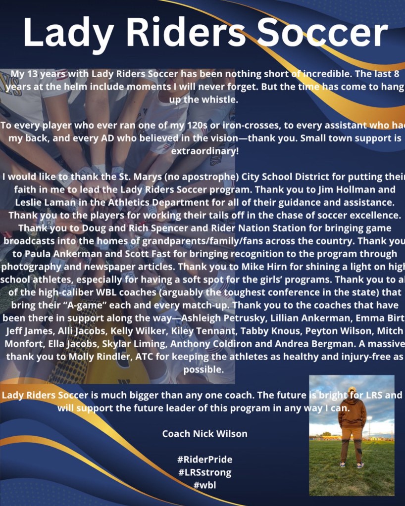 (11-9-22) St.Marys Girls Soccer Coach Nick Wilson is stepping down as the Roughriders coach.