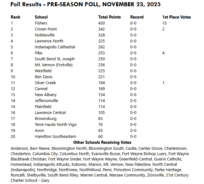(11-23-25) Fishers is #1 in the 2025 Indiana Basketball Coaches Association (IBCA) Pre-Season Boys basketball poll picking up 15 0f the 22 1st place votes. The Tigers jump into the deep end starting the season on Tuesday night against #10 Ben Davis.