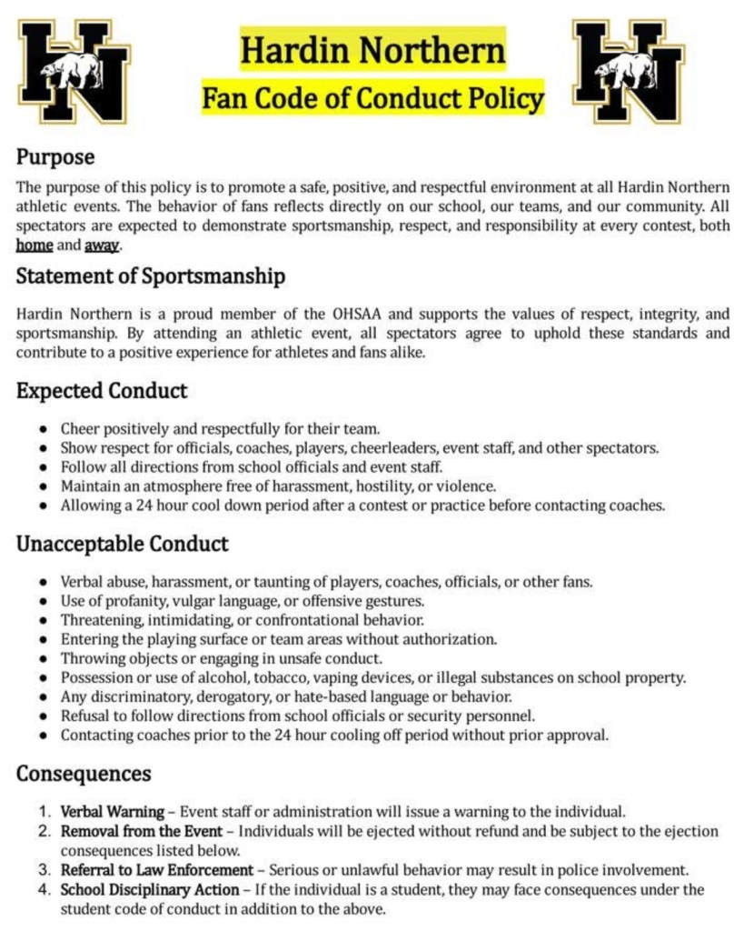 Hardin Northern officials are asking parents and guardians to read the Hardin Northern Administrative Fan Code of Conduct Policy that was approved by the Board of Education at the November Board Meeting.