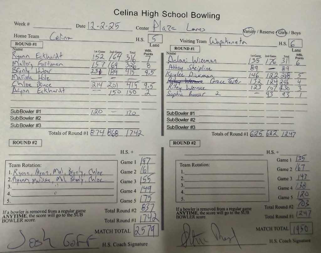 (12-2-25) The Celina Girls Bowling team improve to 4-0 with a 2579-1950 win in WBL action over Wapakoneta at the Plaza Lanes.