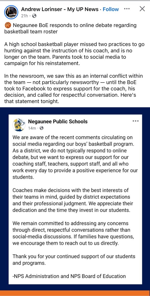 “Varsity players could have hunted 9 full days if they chose. Negaunee basketball values family time. I missed my own kids’ first basketball tournament because Negaunee Varsity Basketball came first. Love our team, love our parents, love our administrators! You only made us stronger.”