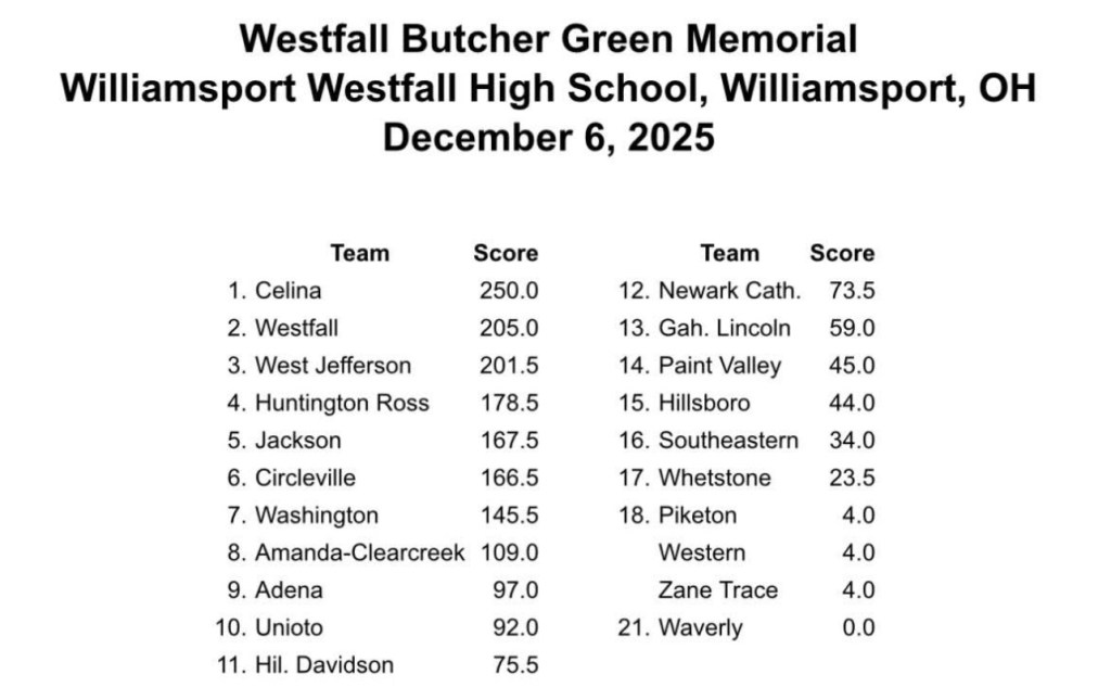 (12-9-25) Celina Wrestling won the 21 team Westfall Invitational this past weekend outdistancing the home team 250-205.