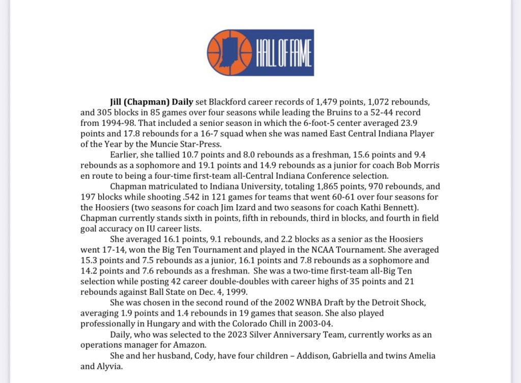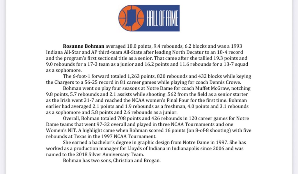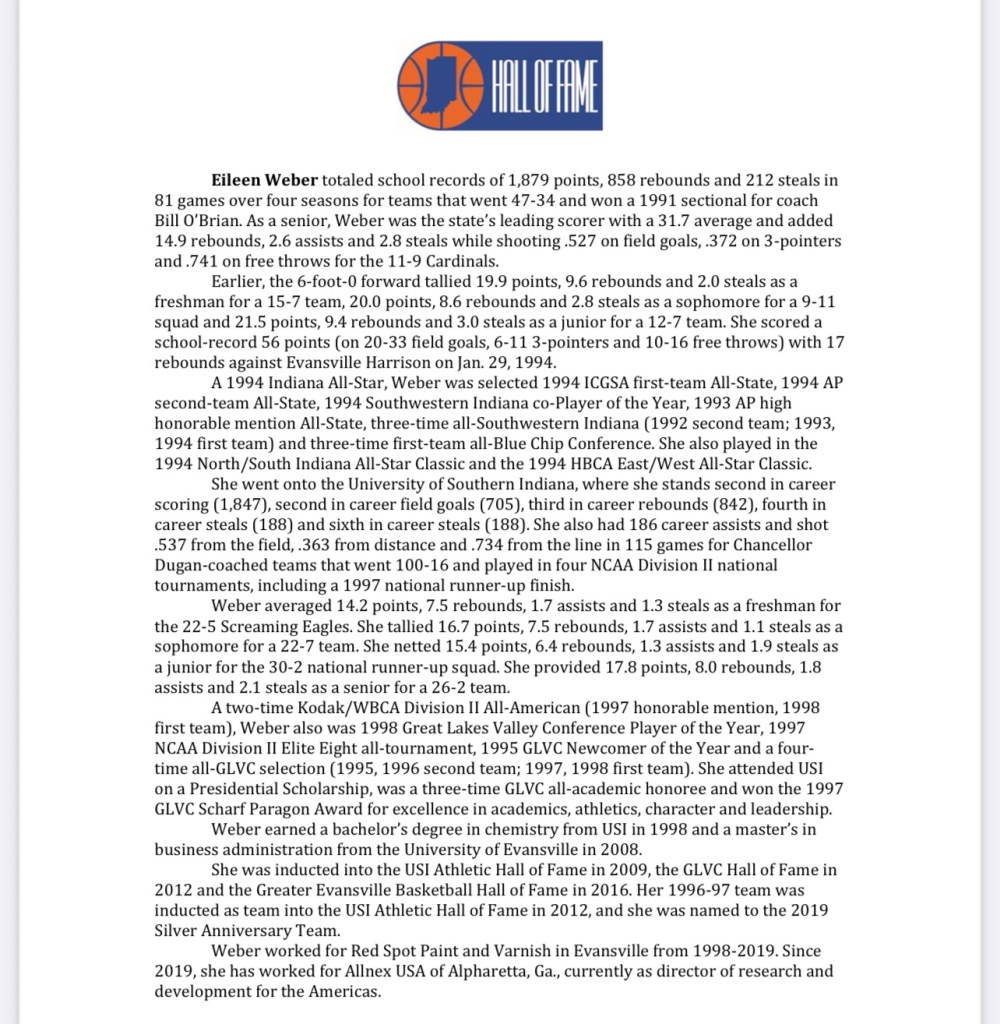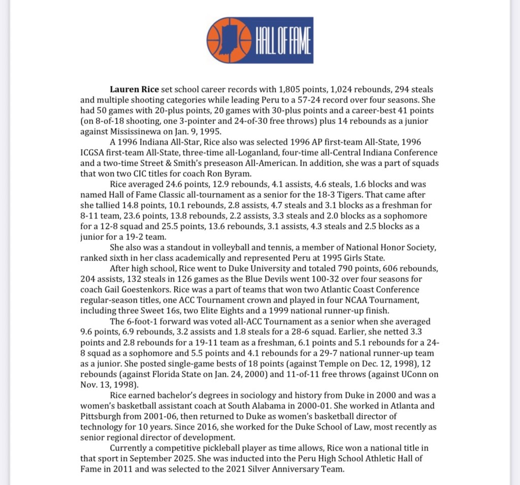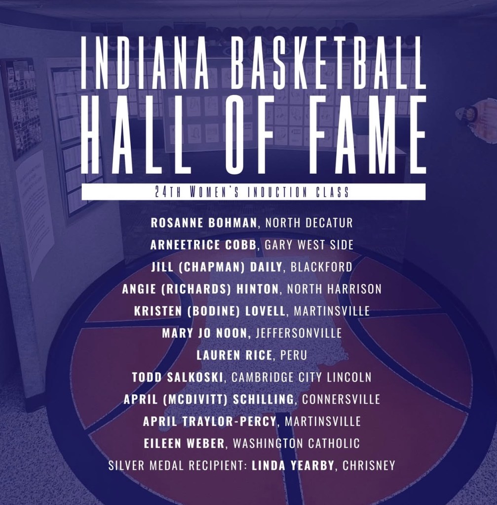 Twelve people are in the induction class, including 1999 Indiana Miss Basketball April (McDivitt) Schilling of Connersville. Those joining Schilling in the class are former Indiana All-Stars Rosanne Bohman of North Decatur, Kristen (Bodine) Lovell of Martinsville, Mary Jo Noon of Jeffersonville, Lauren Rice of Peru, April Traylor-Percy of Martinsville and Eileen Weber of Washington Catholic.