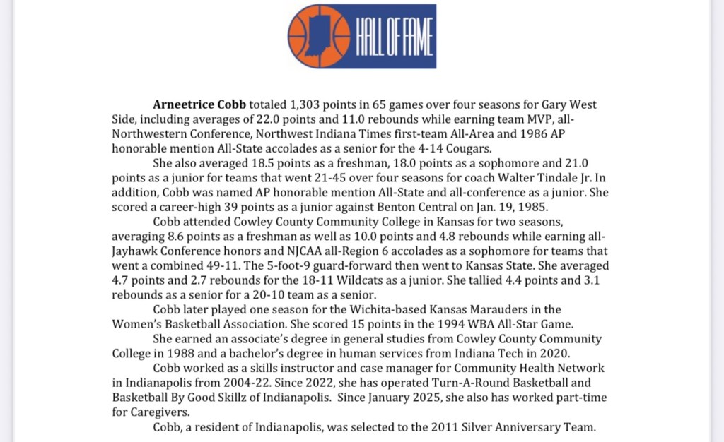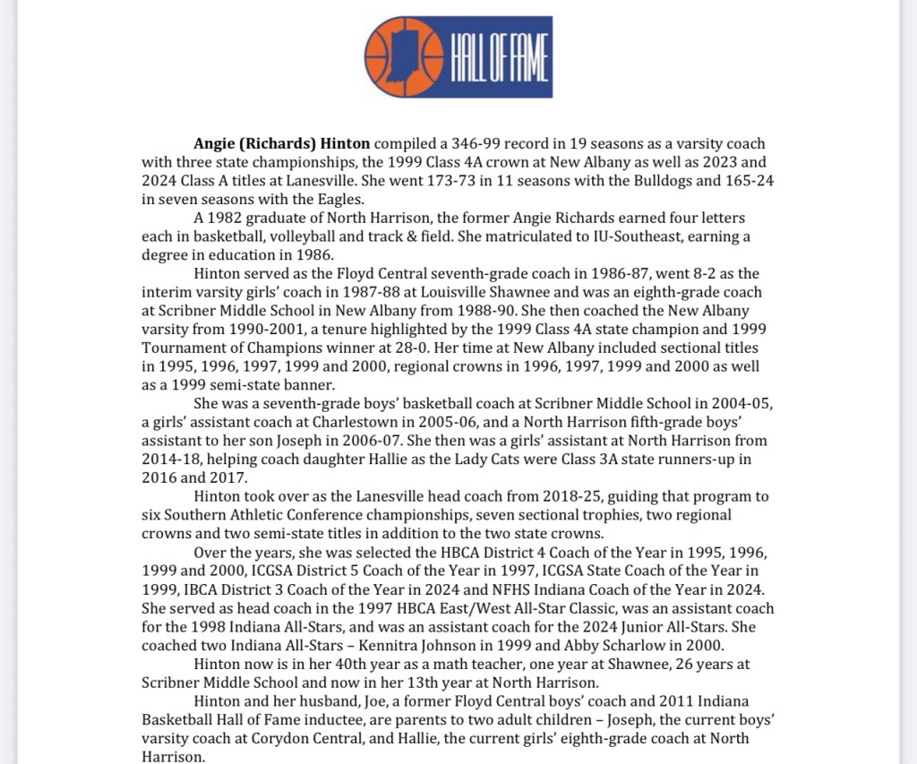 Other former players in the class are Arneetrice Cobb of Gary West Side and Jill (Chapman) Daily of Blackford. The class guy also includes state champion coaches Todd Salkoski of Shenandoah and Angie (Richards) Hinton of New Albany and Lanesville. Completing the class is one contributor, Linda Yearby of Chrisney, as the Indiana Pacers/Indiana Fever Silver Medal winner. The Silver Medal is presented to a person who contributed to Indiana high school basketball in a role other than as a player or coach.