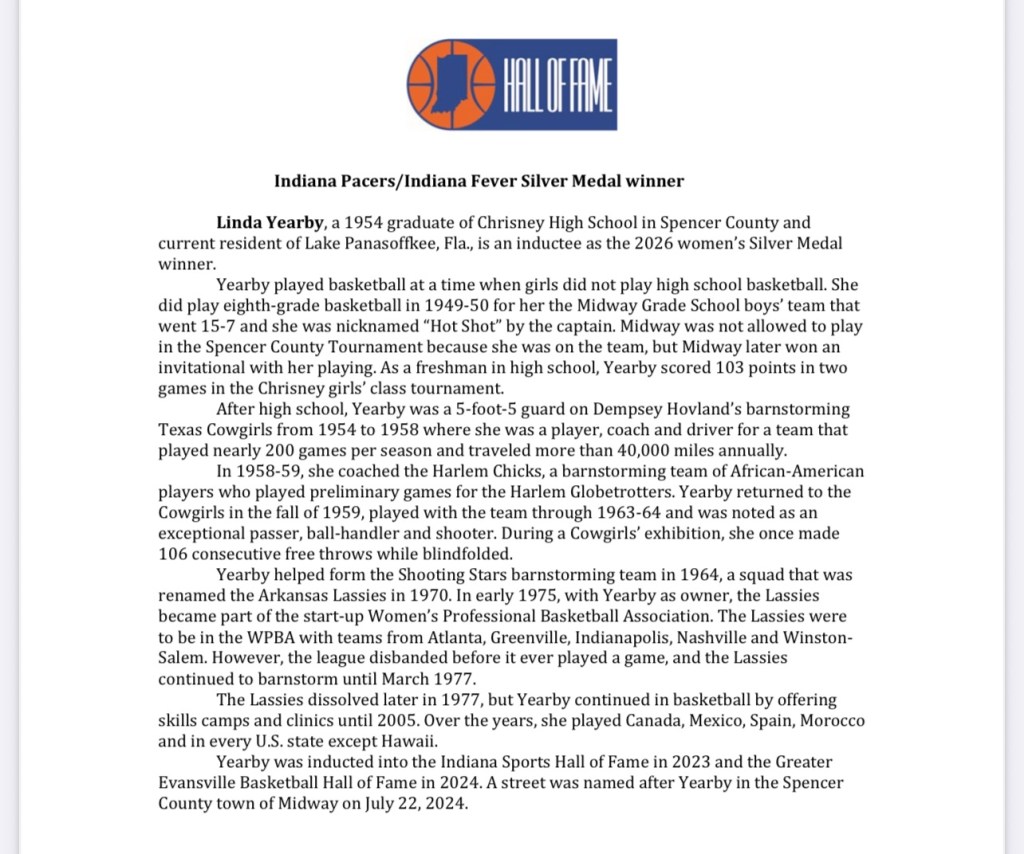 (NEW CASTLE) – Girls’ and women’s basketball in Indiana historically has seen a number of the top players in the nation. The 2026 Indiana Basketball Hall of Fame induction class is no different. The board of directors of the Hall proudly announces its 24th women’s induction class, to be honored in ceremonies on Saturday, April 25, 2026.