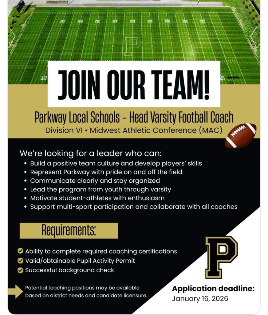 (12-16-25) Parkway Local Schools is searching for our next Head Varsity Football Coach.