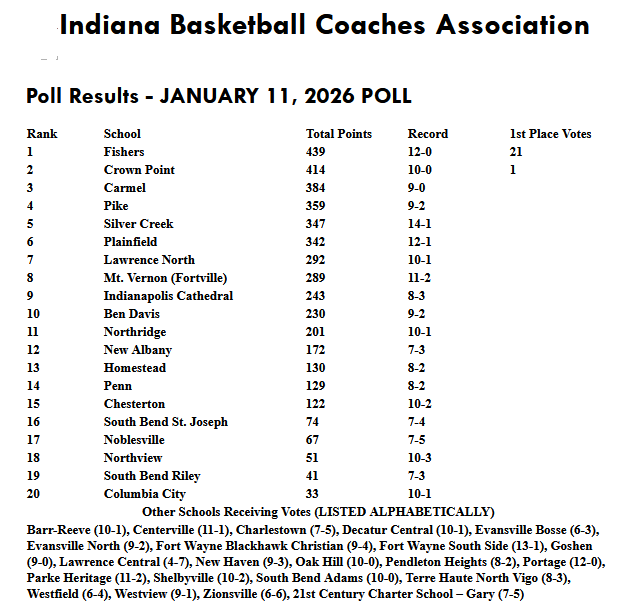 (1-11-26) No surprise this week as Fishers remains #1 (12-0) in the IBCA Boys Basketball poll…thanks to 21 1st place votes. #2 this week is Crown Point (10-0) who picked up the remaining 1st place vote.