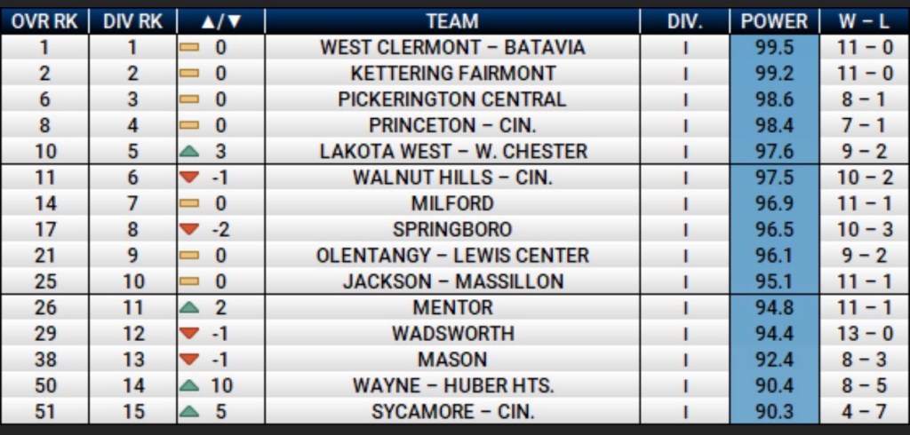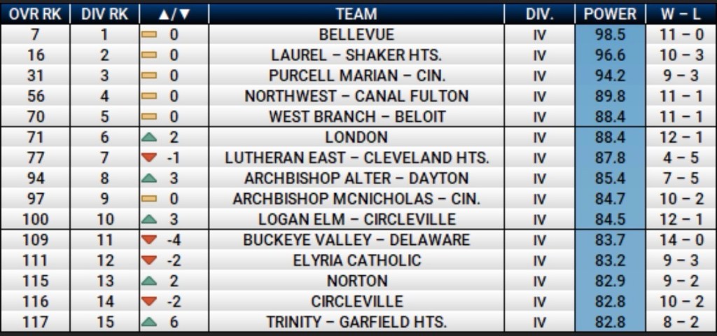 Very little changed at the top of Division IV, as the top three teams continued to separate themselves from the rest of the field. One of the biggest movers was Archbishop Alter, which climbed three spots after a 49–42 win over Carroll — only the Patriots’ second loss of the season.