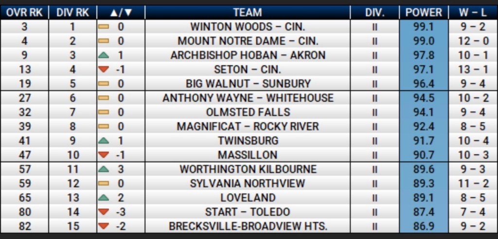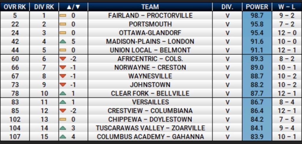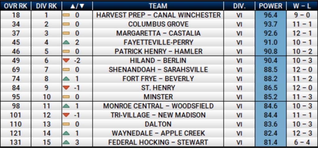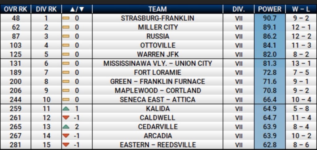 There was absolutely zero movement in the top ten of Division VII this week, but that’s partly because Strasburg-Franklin’s early dominance had already created separation. Their loss to Tuscarawas Valley on Wednesday simply tightened the race.