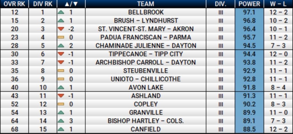 We have a new No. 1 in Division III. Bellbrook moved to the top after handing Monroe its third loss of the season, a dominant 59–26 road victory.