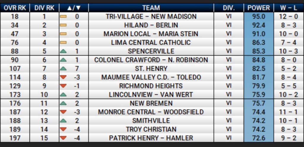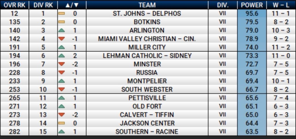 Speaking of Delphos St. John’s, the Bluejays remain miles ahead of the field in Division VII, as Botkins, Arlington, and Miami Valley Christian battle for second place.