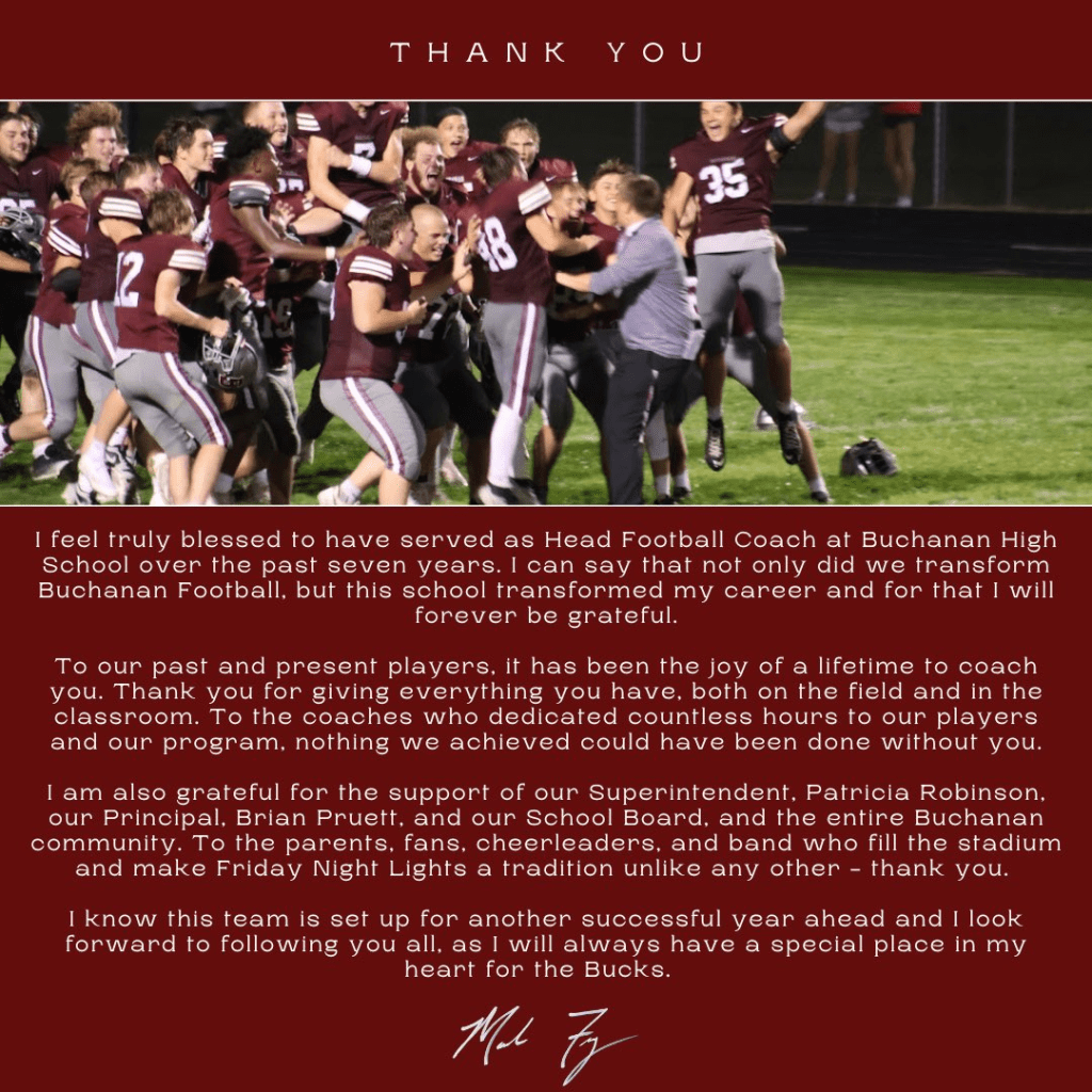 (1-19-26) Buchanan is looking for a new head football coach. Mark Frey announced today on social media that he is stepping down after 7 years.