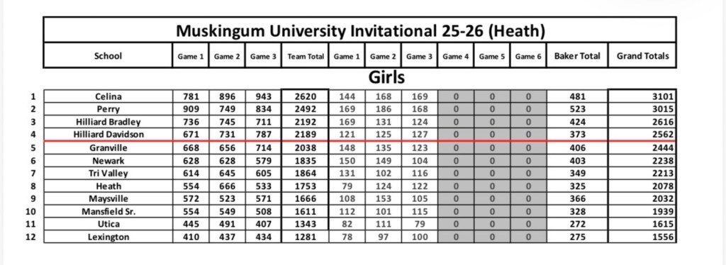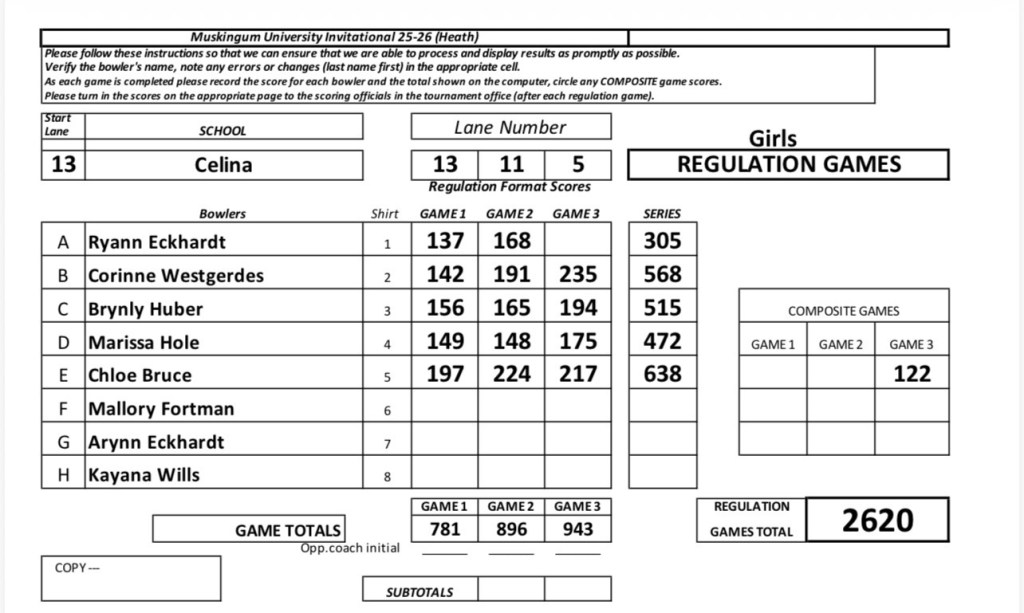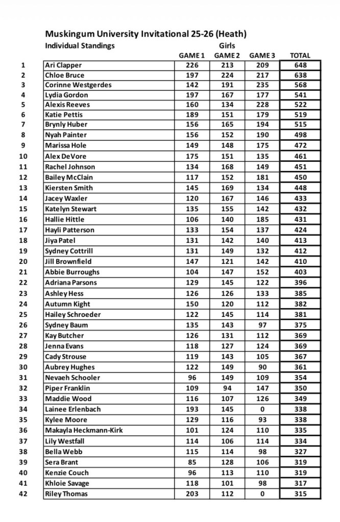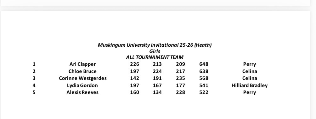 Ladies pick up tournament win number six on the year at the a Muskingum University Invitational. Chloe Bruce led the team with a 638 three-game series and Corinne Westgerdes added a 568, both earning spots on the all tournament team.