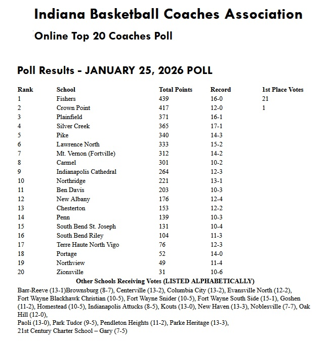 (1-25-26) Guess who is #1 again the week…Fishers (16-0). The Tigers picked up all but one 1st place vote this week to continue in the top spot.