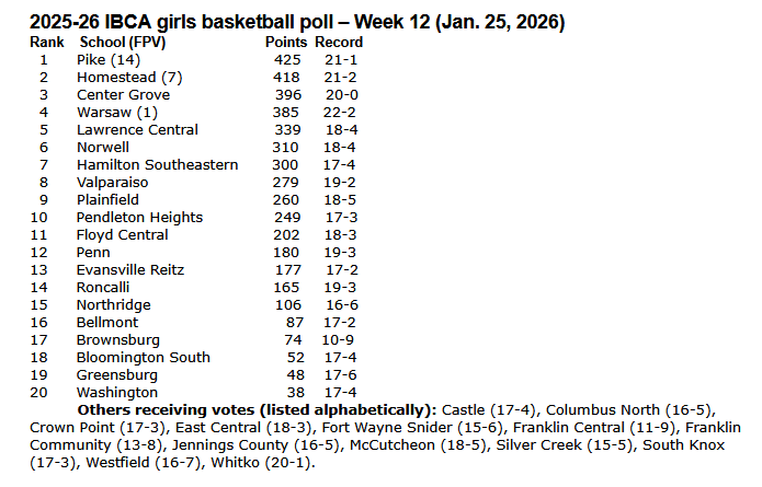 (1-25-26) Pike (21-1) is the new #1 this week in the IBCA girls basketball poll picking up 14 1at place votes.
