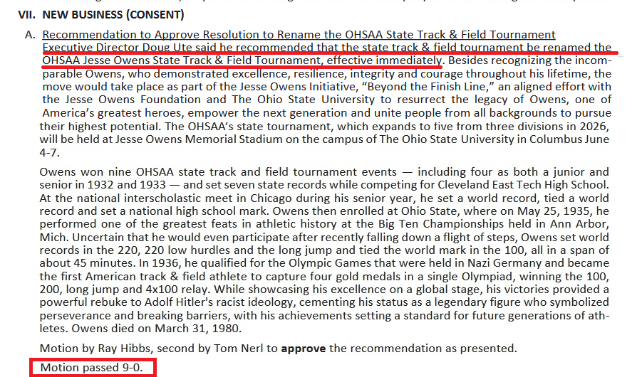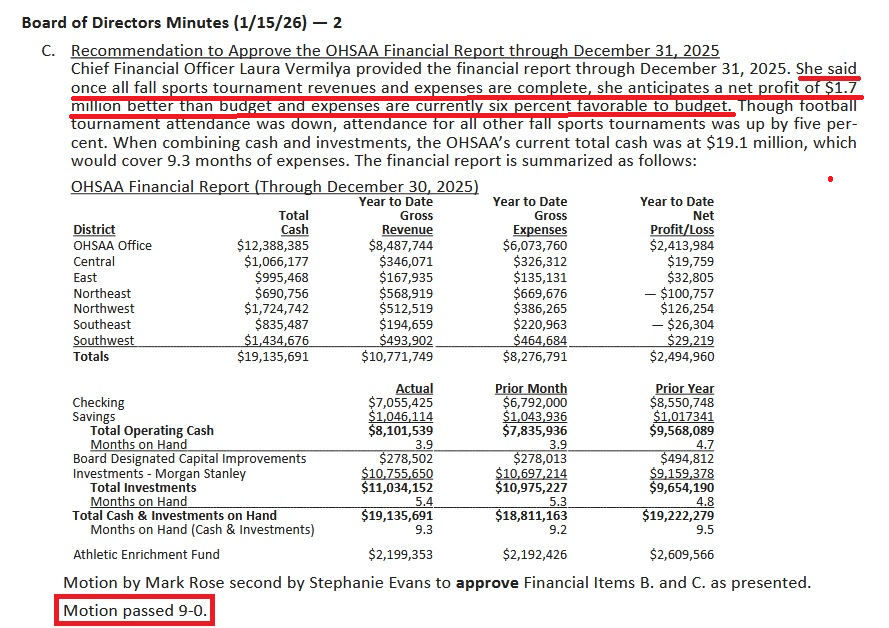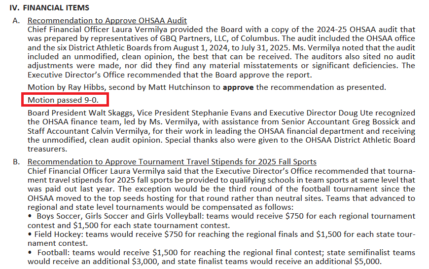 (1-29-26) Every motion passed 9- 0 at the January 15, 2026, OHSAA Board of Directors Meeting. The streak of not having a dissenting vote at a Board meeting from WAY BACK continues.