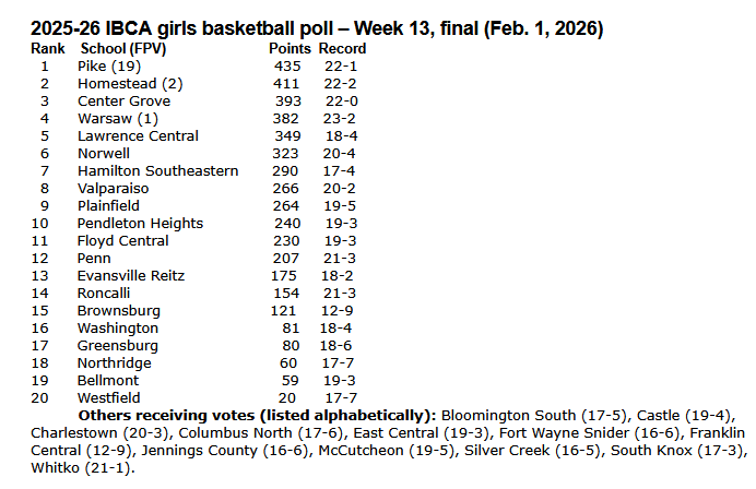 Below are results of the IBCA girls’ basketball poll for Week 13 of the 2025-26 season (Feb. 1, 2026), then final poll of the season. The IBCA poll is a “non-class” poll, where teams are voted to a Top 20 regardless of school classification.