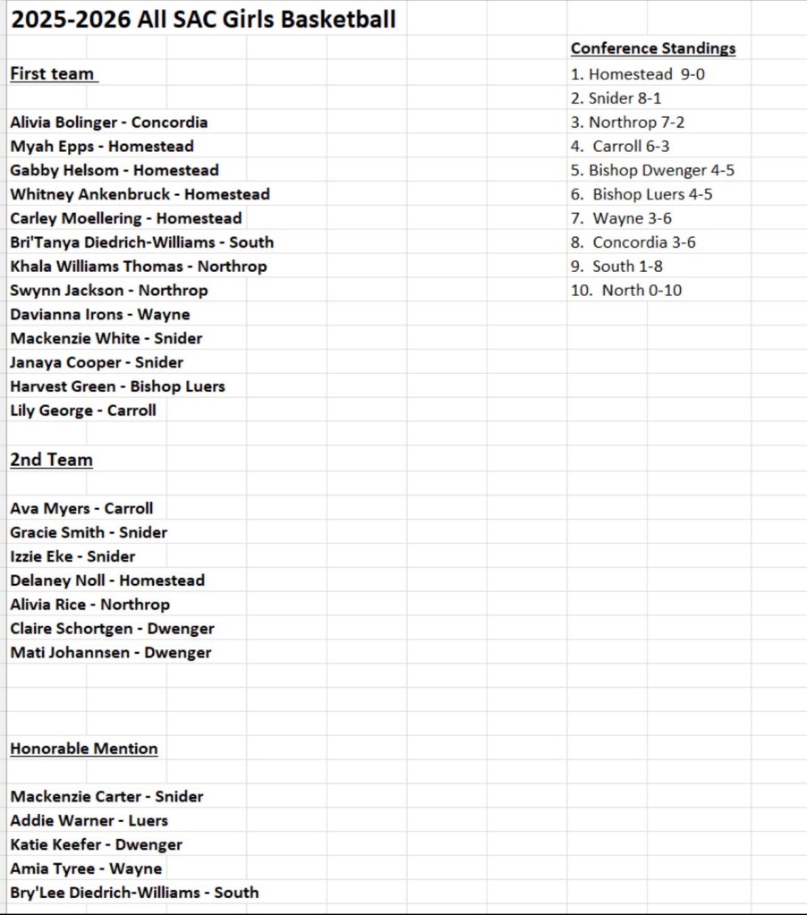 Northrop and Snider both had two named to the 1st team…Concordia, Carroll, South Side Wayne and Bishop Luers each had one player named.