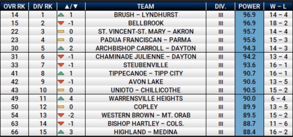 Another week brings another new No. 1, as Brush leapfrogs Bellbrook after closing out January with two major victories. The Arcs earned a 56–48 road win over No. 3 St. Vincent–St. Mary, then followed it up by defeating No. 4 (D-II) Archbishop Hoban, 63–53, on Saturday.