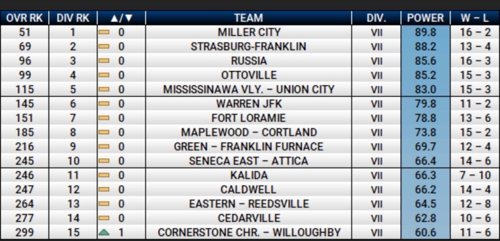 Once again, there was very little movement, with Cornerstone Christian the lone newcomer to the top 15 this week. Miller City held onto the top spot with a 59–24 road win at Wayne Trace, while Strasburg-Franklin picked up a 74–36 victory at Newcomerstown.