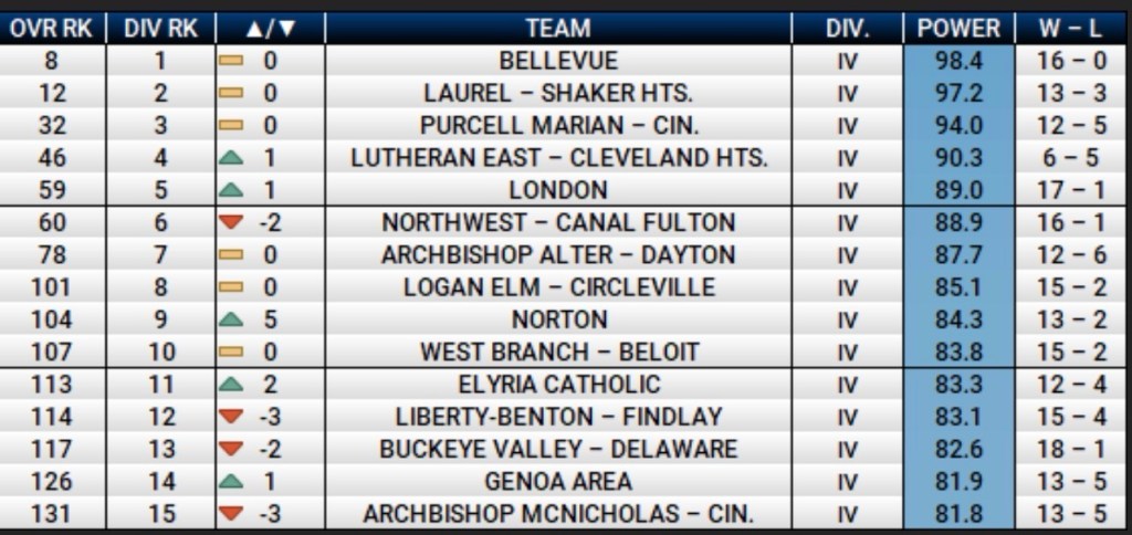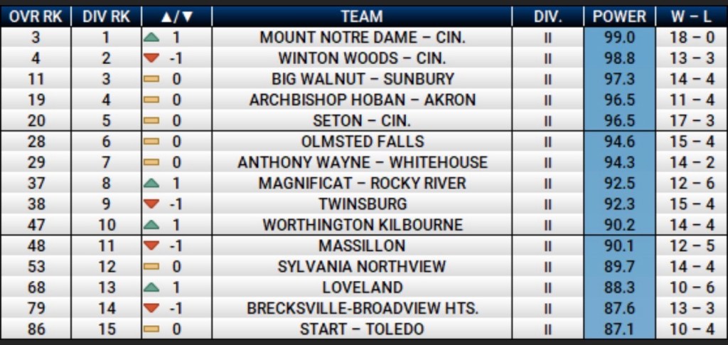 Mount Notre Dame is back on top of Division II following a convincing 69–41 win over a strong Bishop Hartley squad over the weekend. The top five teams remain tightly clustered, each with a legitimate case to be considered a state favorite.