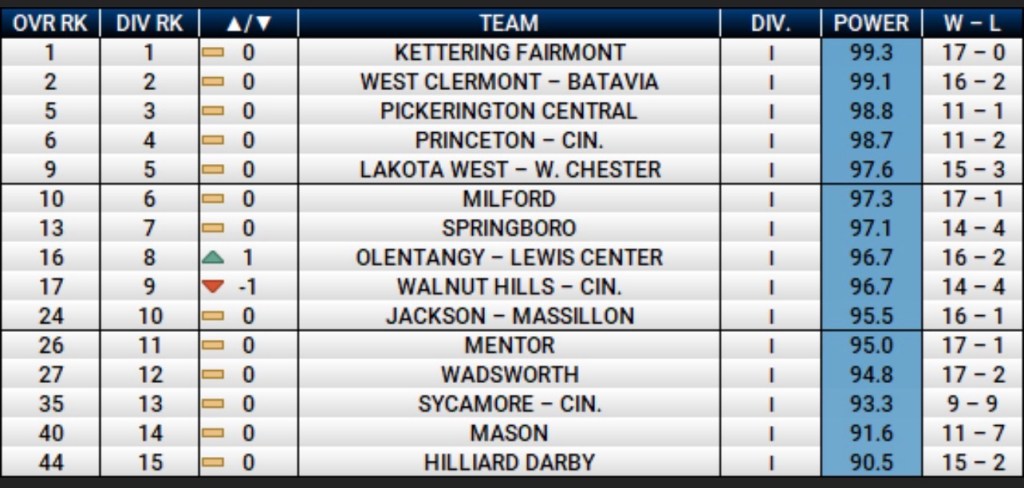 The only movement this past week came with Olentangy and Walnut Hills trading places, while everyone else held steady. No. 4 Princeton heads to No. 1 Kettering Fairmont tonight in what shapes up as the game of the week in southwest Ohio.