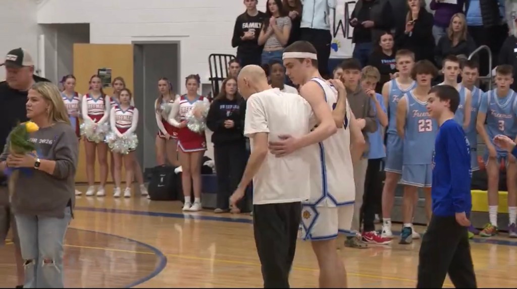 Reece is currently undergoing treatment for stage 4 pancreatic cancer, was able to stand up from his wheelchair and was greeted by cheers from the crowd as he put his arm around his son and walked with him across the court during the Senior Night ceremony.