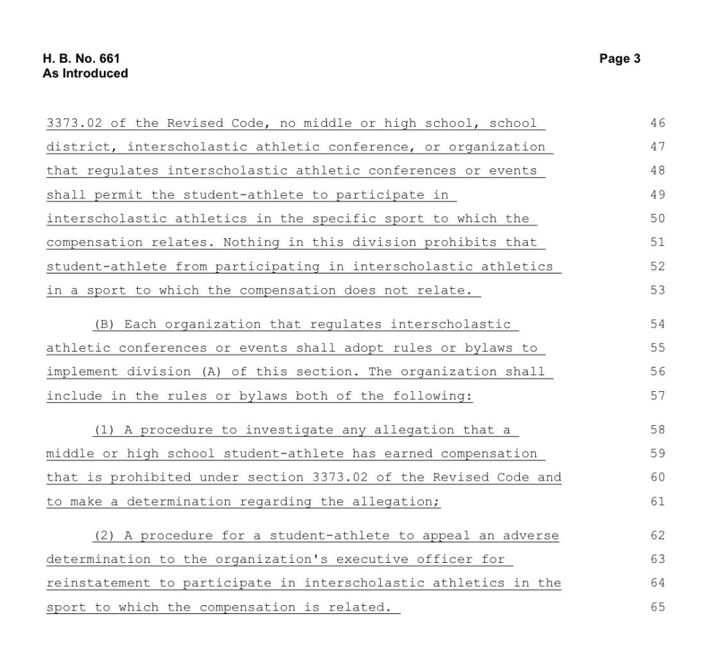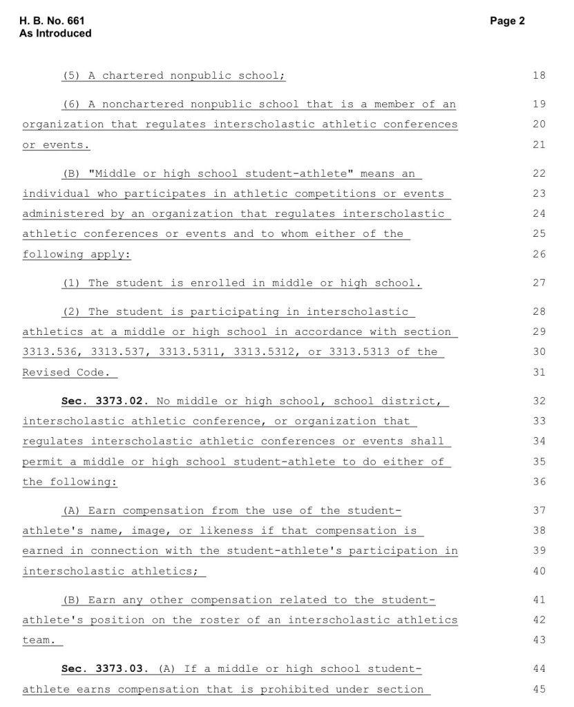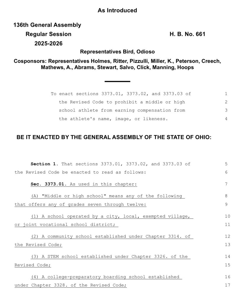 (2-4-26) A new Ohio House bill, House Bill 661, would ban an Ohio High School Athletic Association policy generally allowing middle and high school students to earn money from businesses that use of their name, image and likeness.