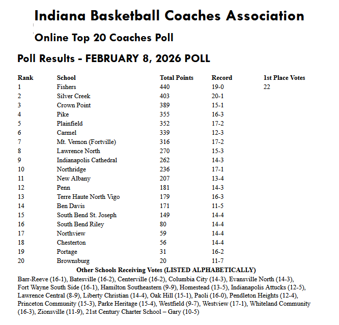 (2-8-26) Fishers (19-0) picked up all 22 1st place votes this week in the IBCA Boys Basketball Poll. The Tigers are the only remaining undefeated team in this week’s Top 20 rankings. Another undefeated team Paoli (16-0) received voted.