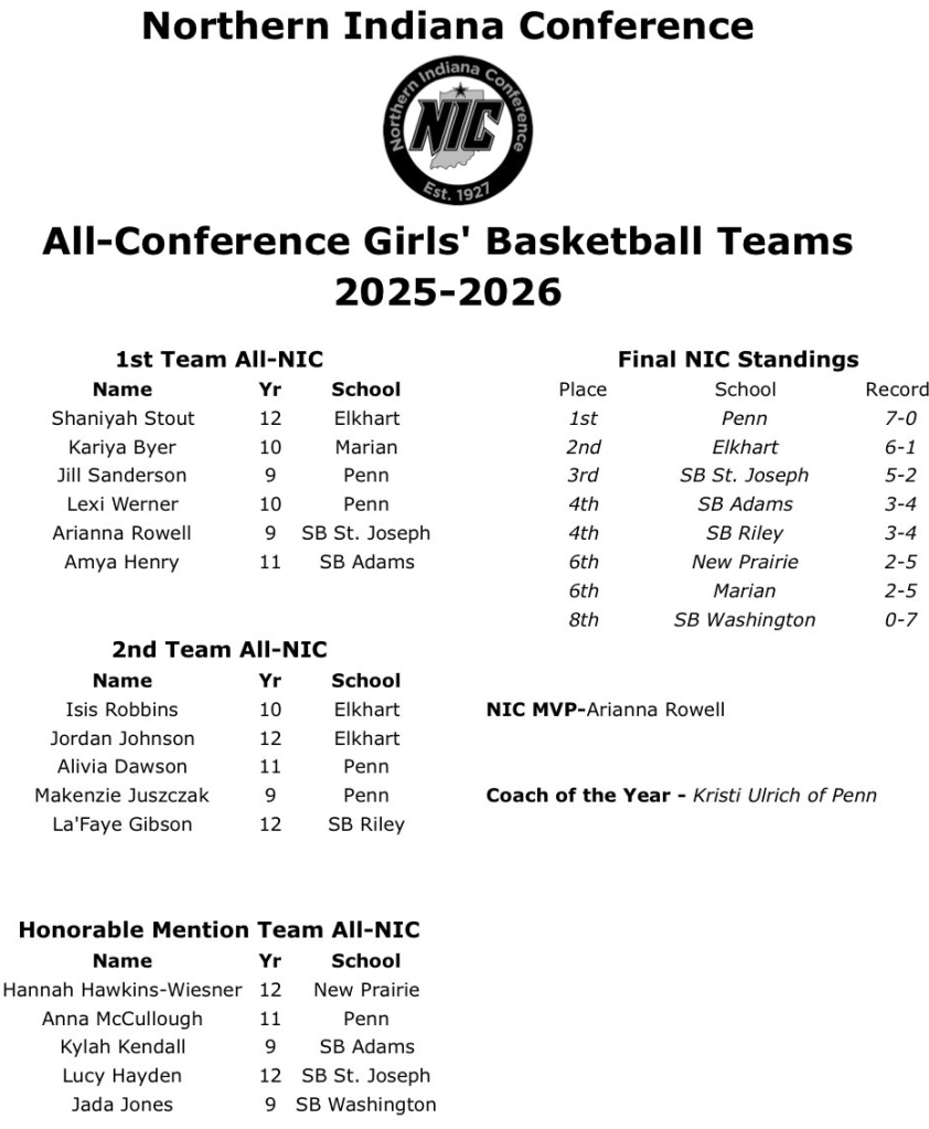 South Bend St. Joe’s Arianna Rowell was named the NIC MVP, Kristi Ulrich, who led Penn to the NIC title, was named the Coach of the Year.