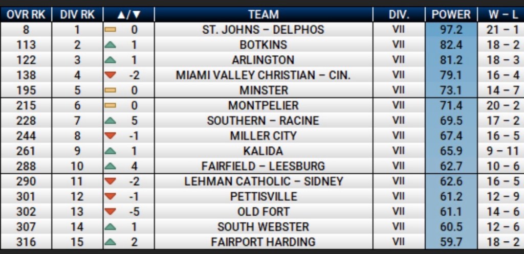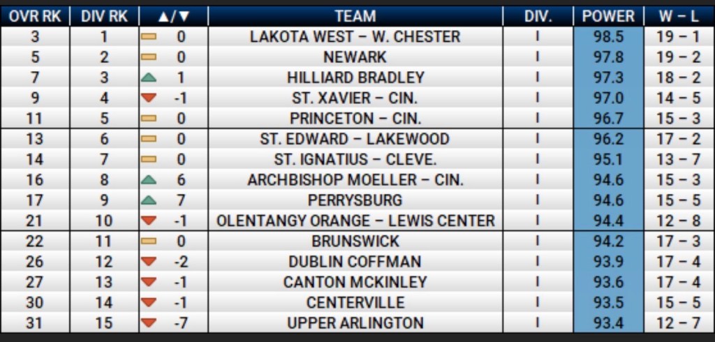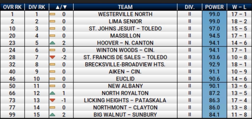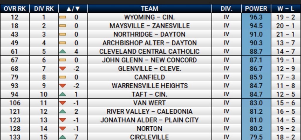 Another notable climber is Leesburg Fairfield, which picked up key wins over Whiteoak and Peebles over the weekend. A potential meeting with Southern at the Ohio Dominican regional could be one of the most compelling matchups in the division.