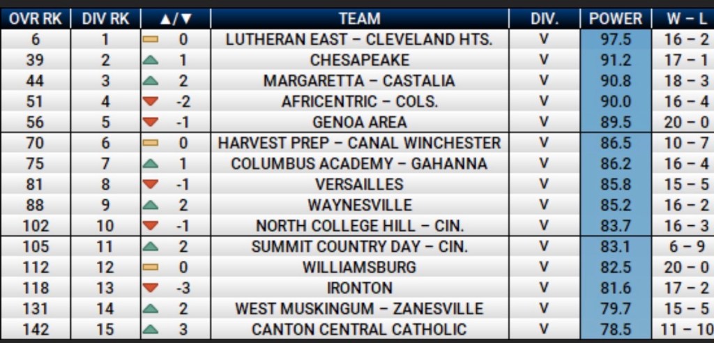 While Lutheran East remains perched atop Division V, several teams are surging late. Margaretta, Waynesville, Summit Country Day, West Muskingum, and Canton Central Catholic all made notable jumps in the latest rankings — with Margaretta standing out as the most dangerous of the group.