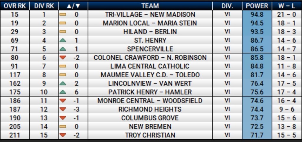 Patrick Henry jumped six spots after ripping off eight straight wins before a one-point loss to Liberty-Benton. During that streak, the Patriots defeated Wauseon, 14-win Liberty Center, and 13-win Archbold.